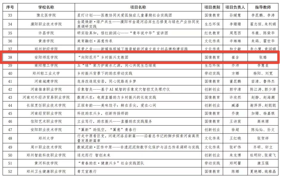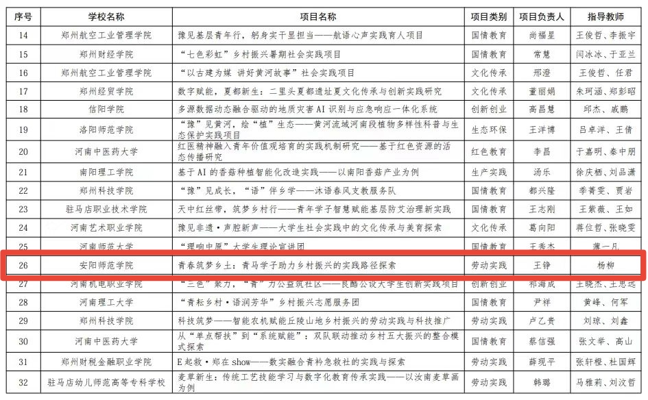 项目《青春筑梦乡土:青马学子助力乡村振兴的实践路径探索》以安阳师范学院青年马克思主义者培养学院育人实践为依托,通过实施“红色铸魂、产业赋能、教育扶智、生态守护、文化润乡”五大行动,让青年学生在乡土实践中坚定理想信念、锤炼过硬本领、厚植为民情怀,实现学校人才培养与乡村振兴的有机融合,赢得了实践地群众的高度认可和社会各界的积极评价。项目《“向阳花开”乡村振兴支教团》以“语你同行,筑梦乡村”为核心,构建了“基础教学+特色活动+红色传承”三维实践体系,形成了“可借鉴、可推广、可复制”的外语专业人才培养与教育帮扶深度融合的实践模式,取得了良好的实践育人实效。
