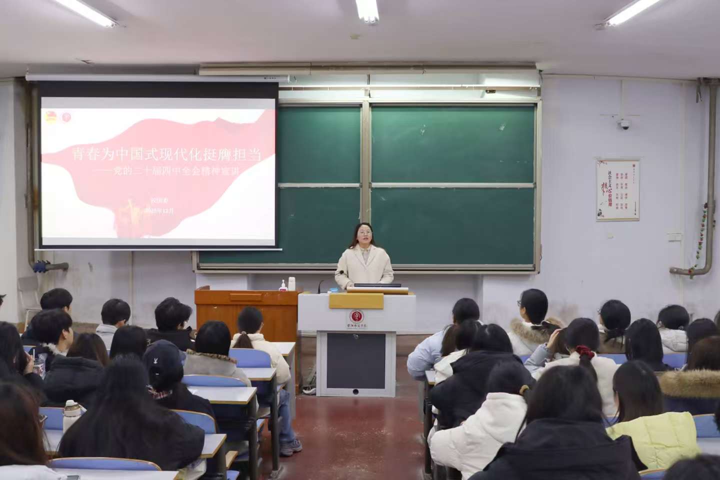 为深入学习贯彻党的二十届四中全会精神,引领青年筑牢信仰根基、汇聚奋斗伟力,12月28日,在和展阶梯201教室,青年讲师团成员苏林晓、马玉婷、李二鹏为文学院、数学与统计学院以及资源环境旅游学院青年学生代表进行宣讲。